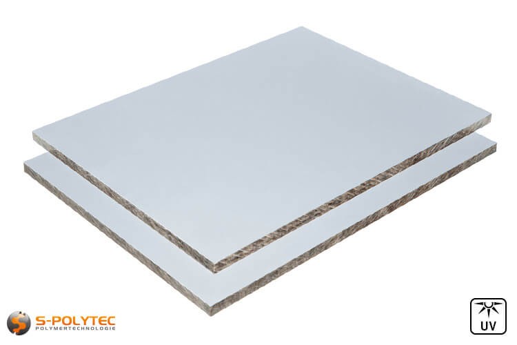Weatherproof, scratch resistant HPL panels for indoor and outdoor use with silvergray surface decor on both sides in thicknesses of 6mm or 8mm.