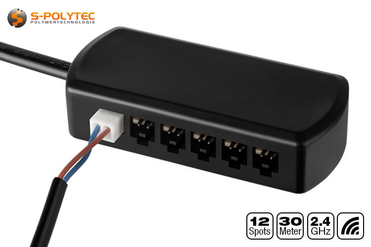 The S-Polylight LED power controller is fully pre-wired so that no tools are required for installation. The 90 cm long mains cable for the power supply is permanently connected. The HUB, which provides the connections for the twelve LED spots, is also permanently connected to the power supply unit. The connection cables required for this are included with each individual spotlight so that the 2-pin plug can simply be plugged into one port of the HUB after the respective cables have been laid.
